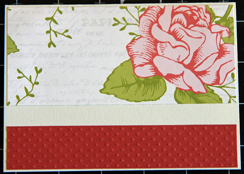 Start med at lime det mønstrede papir i toppen af kortet og det ensfarvede i bunden - husk at lave ens afstand til kanten af kortbasen hele vejen rundt.